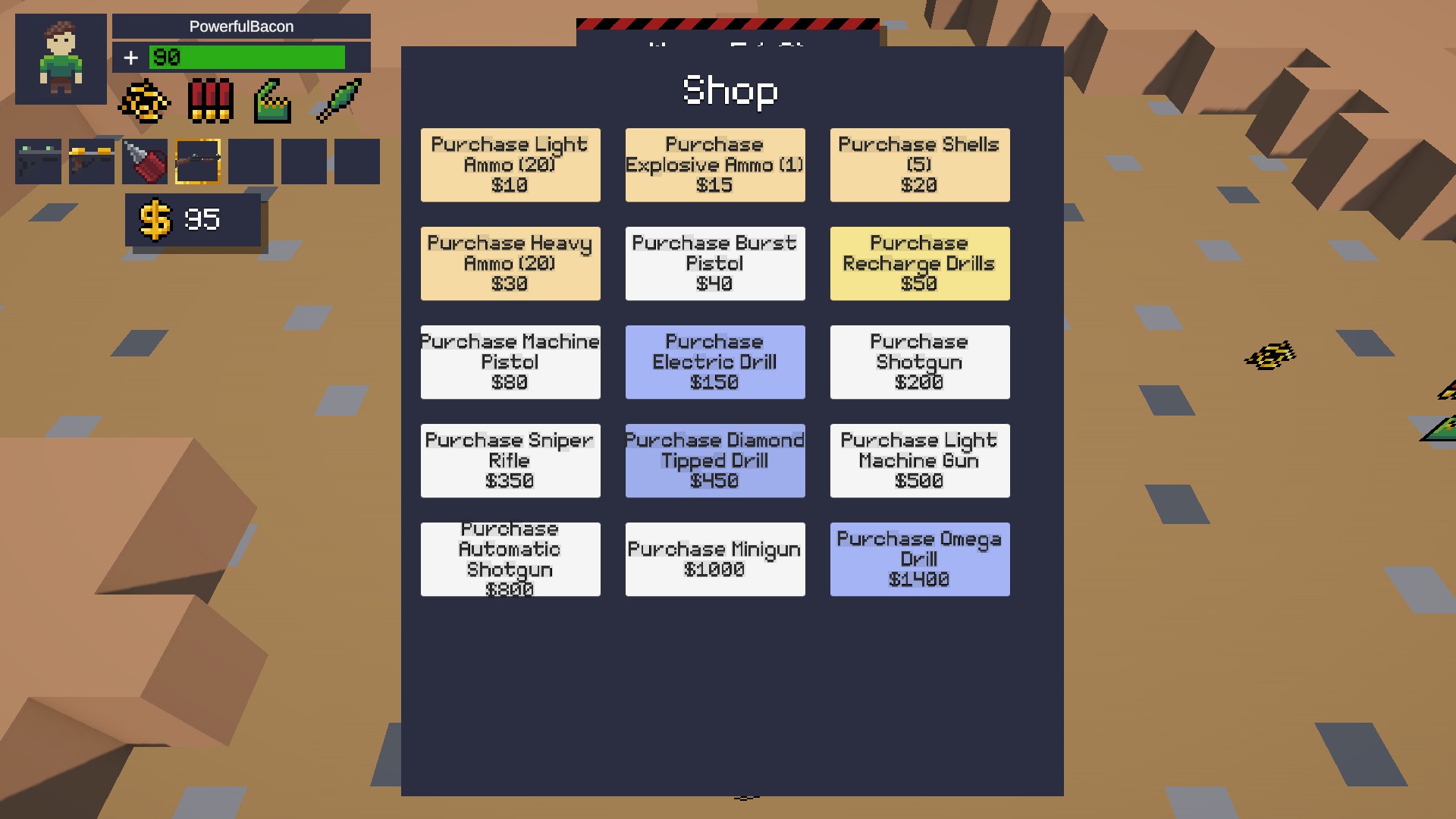 - Purchase better weapons and drills at the shop, which allow you to progress further out (where you will find better ores)