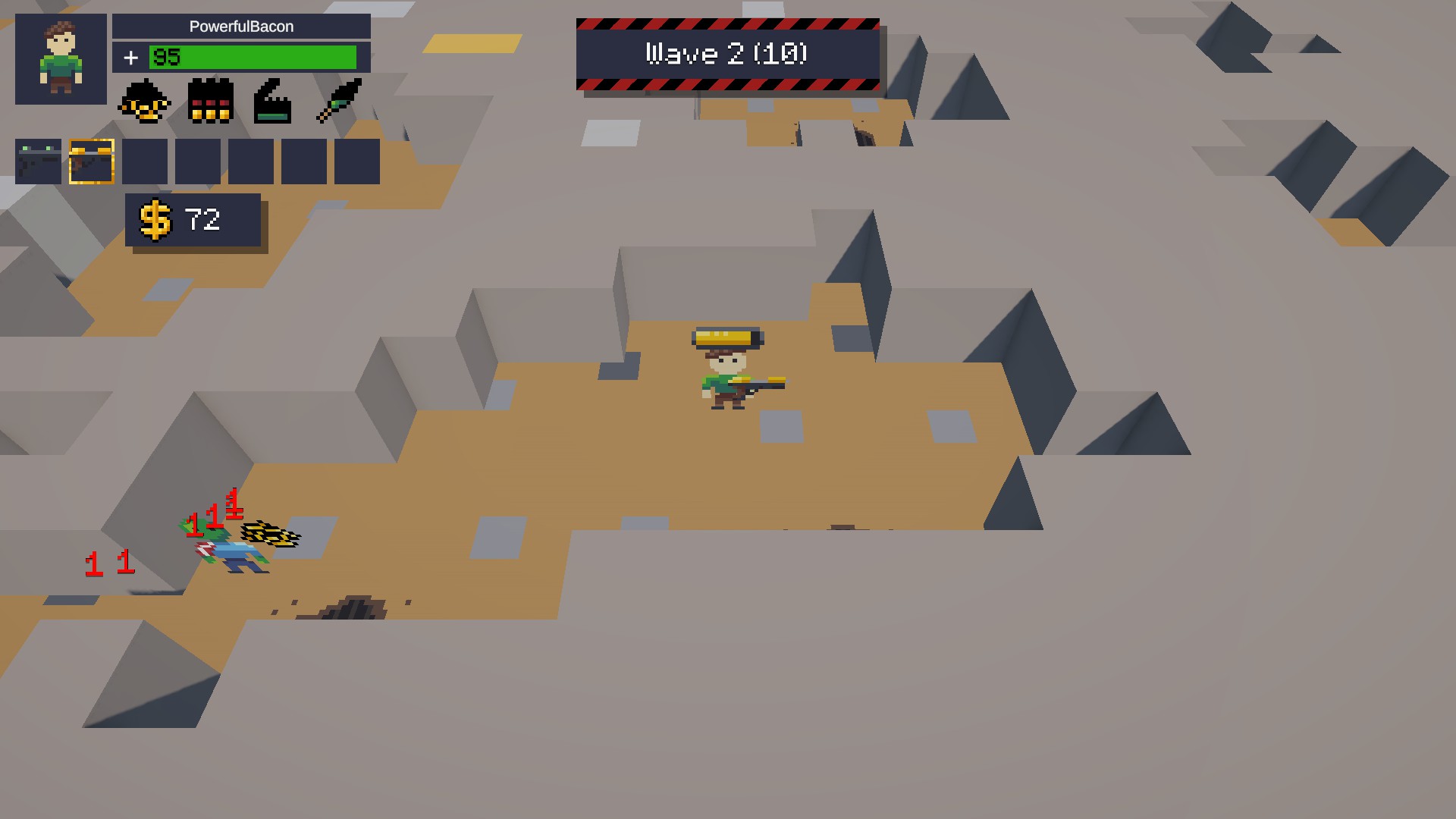 - You start weak, with only a basic pistol (left mouse button) and a pickaxe (right mouse button)